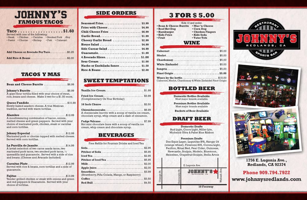 Introducing the menu at Johnny’s Tacos And Sports, a vibrant spot in Redlands, CA that offers a fantastic mix of Mexican cuisine, burgers, hot dogs, and fresh salads. The appetizers, including shrimp & fries, fried zucchini, and asada fries, are perfect for sharing while watching a game on one of the many TVs. Try the classic burger or the bacon wrap hot dog for a satisfying meal. The customer reviews rave about the great service and family-friendly atmosphere at Johnny’s. With options like private lot parking, outdoor seating, and free Wi-Fi, this is a great place to hang out with friends and family, catch a game, or host a birthday party. Stop by Johnny’s Tacos And Sports for a fun, delicious dining experience.